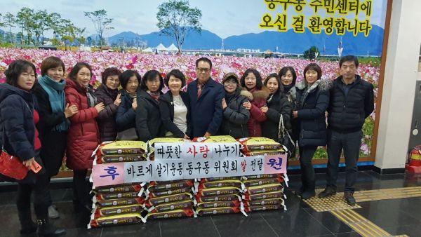 한편 지난 12월 12일에는 바르게살기운동 동구동위원회에서도 동구동 주민센터에 백미 40포를 기부해 따뜻한 사랑을 나누었다. 바르게살기운동 동구동위원회는 추운 겨울 백미 후원을 통해 저소득층 가정에 따뜻한 마음까지 가득 채워지길 바란다는 뜻을 전했다.