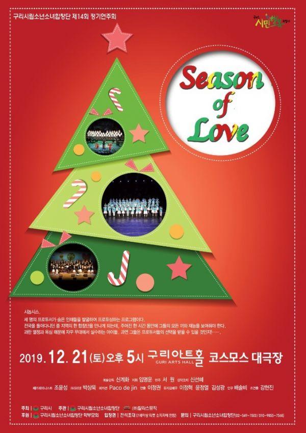 ‘Season of love’라는 부제로 꾸며지는 이번 공연은 연말의 기분을 한껏 즐길 수 있는 크리스마스 캐롤이 있는 합창곡 모음과 화려한 뮤지컬 OST로 구성된 뮤지컬 갈라쇼로 진행된다. 유명 뮤지컬의 명곡들을 모아 합창곡으로 재구성한 이번 무대는 아름다운 영상과 명곡이 주는 뮤지컬 합창 음악의 진수를 보여줄 것으로 기대된다.