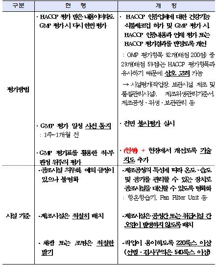 주요 개정 내용은 GMP 준수여부 불시 조사·평가 및 현장기술지도 도입 GMP 평가에 HACCP 평가결과 반영 공조시설 및 작업장 밝기 등 시설기준 명확화 등이다.