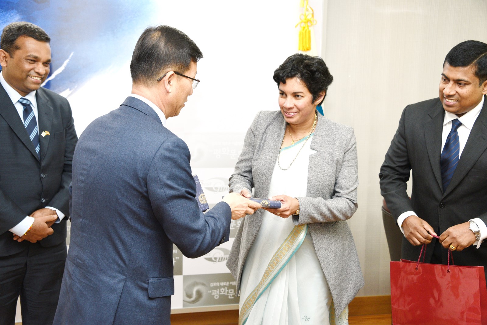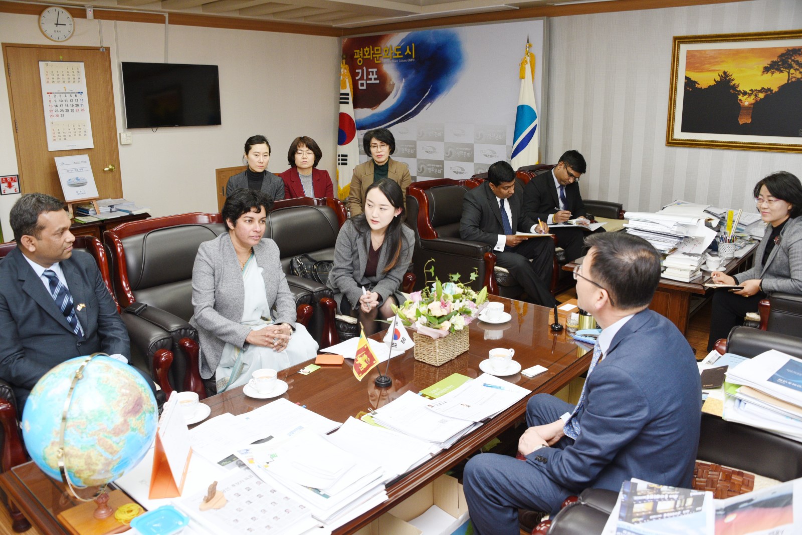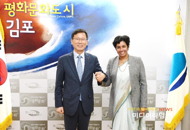 | 1. 유영록 김포시장과 마니샤 구나세이카라 주한 스리랑카 대사가 환담 뒤 기념 사진을 찍고 있다. <ⓒ미디어타임즈> |