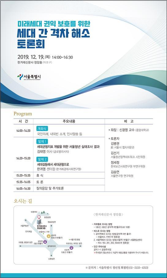 이와 관련해 서울시는 19일 오후 2시 한겨레신문사 3층 청암홀에서 '미래세대 권익 보호를 위한 세대 간 격차 해소'라는 주제로 토론회를 개최한다.