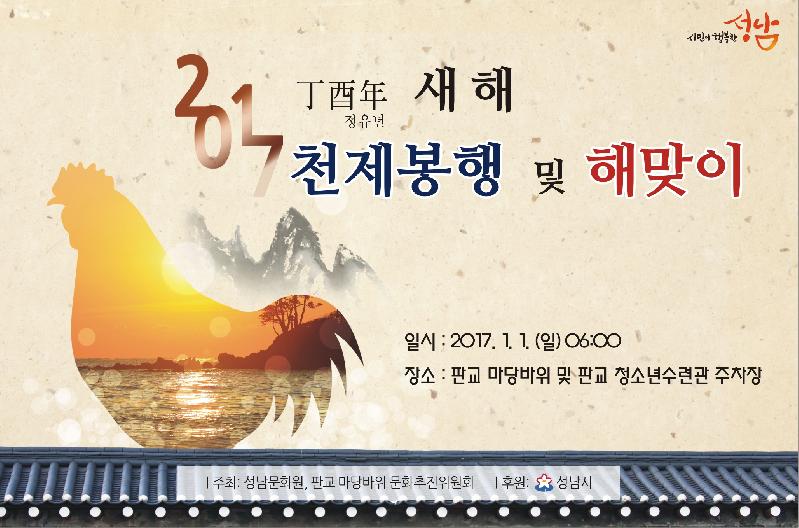 [미디어타임즈= 신정식 기자] 성남문화원(원장/김대진)과 판교마당바위 문화추진위원회(위원장/한문수)는, 丁酉年(정유년)을 맞이하는 첫 아침을 성남시의 발전과 시민의 행복을 기원하고, 새해 소망을 기원하는 「2017 새 해, 천제봉행 및 해맞이」행사를 오전 6시 50분부터 판교 마당바위에서 개최한다.
