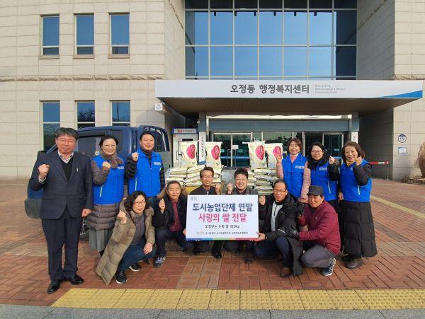 부천시는 지난 13일 오정동 행정복지센터 앞에서 ‘도시농업단체 연말 사랑의 쌀 전달식’을 개최했다. 후원 쌀 32포는 도시농업단체 등이 오정텃논에서 직접 농사를 짓고 수확해 마련했다.