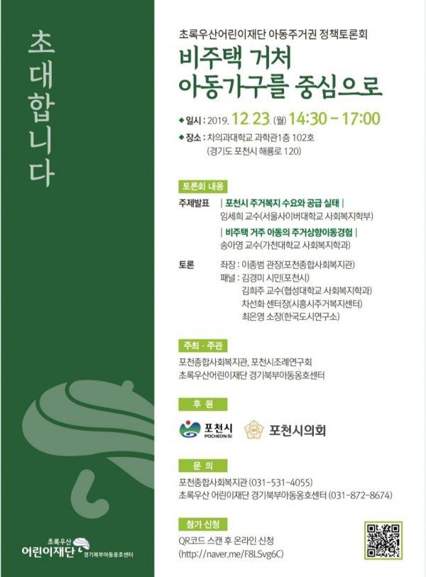 어린이재단 경기북부아동옹호센터, 포천시조례연구회와 공동 주최로 열리는 이번 정책토론회는 컨테이너, 비닐하우스 등 비주택에 거주하는 아동가구의 주거복지 현황을 파악하고 대안을 모색하기 위해 마련됐다.