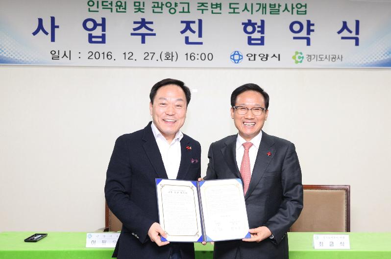안양시(시장 이필운)와 경기도시공사(사장 최금식) 간에 인덕원·관양고 일대 도시개발에 공동 노력할 것을 다짐하는 협약식이 27일 오후 4시 청사 접견실에서 있었다.