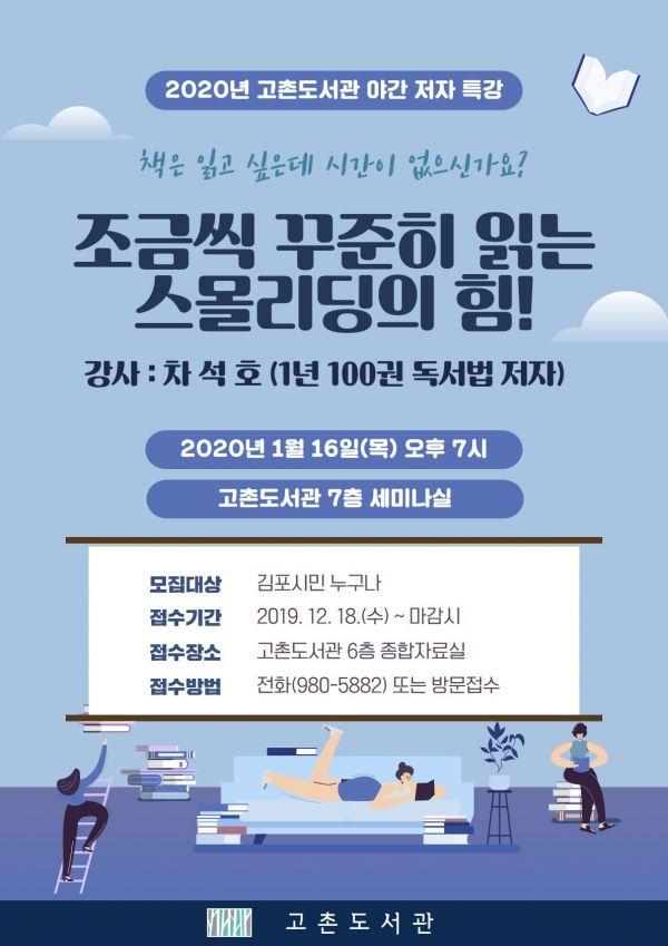 김포시 고촌도서관은 2020년 새해를 맞이해 오는 2020년 1월 16일 오후 7시 도서관 7층 세미나실에서 ‘조금씩 꾸준히 읽는 스몰 리딩의 힘’을 운영한다.
