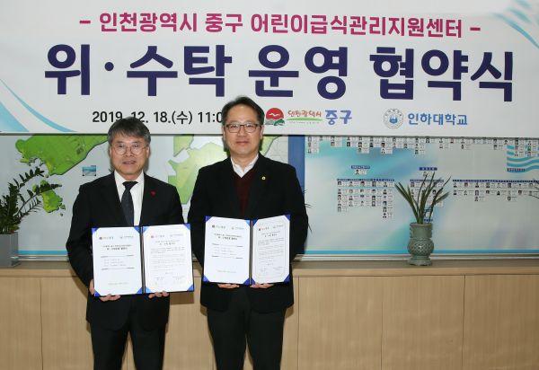 인천 중구는 18일 구청장실에서 인하대학교 서태범 산학협력단장을 비롯한 관계자들이 참석한 가운데 인천 중구 어린이급식관리지원센터 위·수탁 협약을 체결했다.