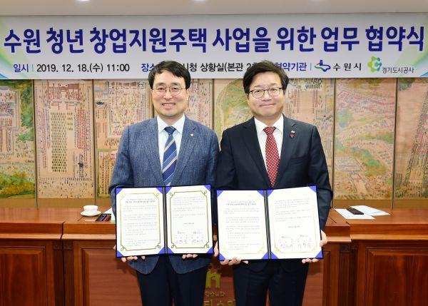수원시와 경기도시공사는 18일 수원시청 상황실에서 ‘수원 청년창업지원주택사업 추진을 위한 업무협약’을 체결하고 청년창업지원주택사업 사업에 적극적으로 협력하기로 했다.