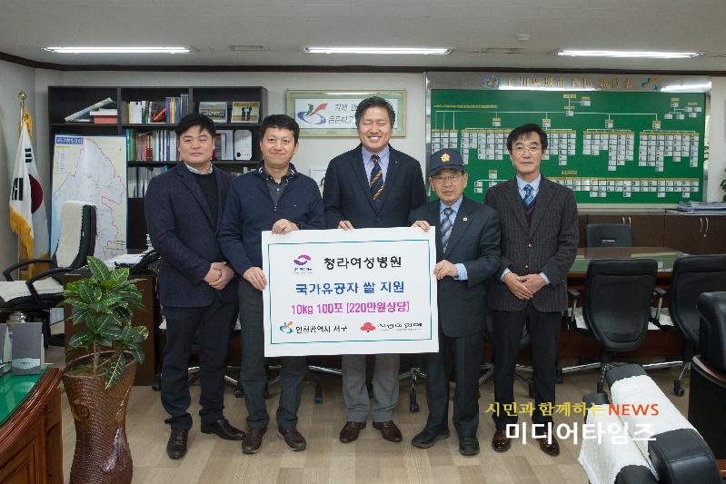 [미디어타임즈=문상수 기자] 인천광역시 서구(청장 강범석)는 지난 27일 청라여성병원(원장 손문성)으로부터 저소득 보훈가족을 위한 양곡을 기탁 받았다.청라여성병원은 청라국제도시 내 위치한 전문병원으로서, 산부인과․소아청소년과를 비롯하여 내과, 외과․건강검진센터 등 다양한 분야의 전문의를 통해 고객중심의 선진형 의료문화를 실천하고 있다.청라여성병원 관계자는 “매년 양곡 지정기탁은 물론 다양한 사회공헌활동을 통해 지역주민과 함께 하는 따뜻하고 행복한 병원이 되도록 하겠다”고 전했다.