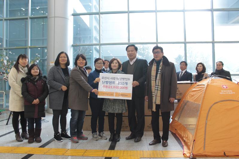 한편 오산시 사랑의 난방텐트 추진위원회는 2015년 12월 조직되어 연료비 부족으로 마음껏 난방을 하지 못하고 추운 겨울을 보내는 이웃들을 위해 실내용 난방텐트를 후원 및 설치해 주고 있으며, 전달 받은 난방텐트는 오산시 지역아동센터와 주거환경이 열악한 저소득 가정에 전달될 예정이다.