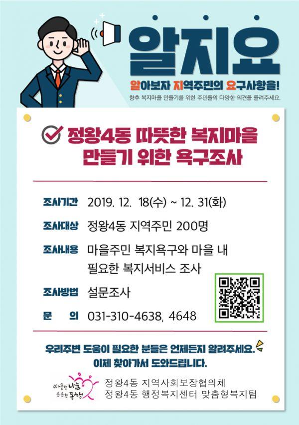 정왕4동 행정복지센터는 주민들이 느끼는 복지환경과 요구를 알아보기 위해 정왕4동 주민들을 대상으로 ‘복지욕구조사’를 이달 18일부터 31일까지 실시한다.