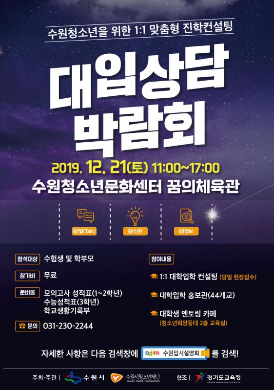 수원시는 21일 오전 11시부터 오후 5시까지 팔달구 수원청소년문화센터 꿈의 체육관에서 ‘2020학년도 대입상담 박람회’를 연다.