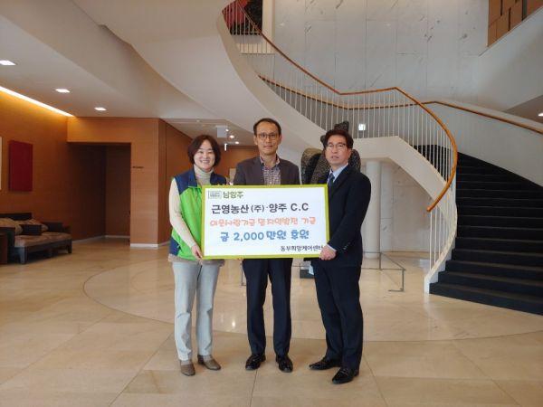근영농산은 지난 18일 남양주 화도읍 양주컨트리클럽에서 소외된 이웃 지원 및 지역사회 발전을 위한 후원금 2,000만원을 동부희망케어센터에 전달했다.