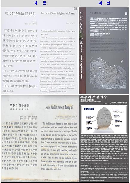 올해 개선사업은 그동안 문화재 안내판 문안이 전문가 의견을 우선시해 설명이 어렵고 딱딱해 국민에게 필요한 정보를 제대로 갖추지 못하였던 것과는 달리해 국민이 직접 참여하는 이해하기 쉬운 안내문안, 국민이 알고 싶은 정보 중심의 유용한 안내문안, 지역 고유의 역사문화를 이야기로 반영한 흥미로운 안내 문안을 목표로 안내판 정비를 시행했다.