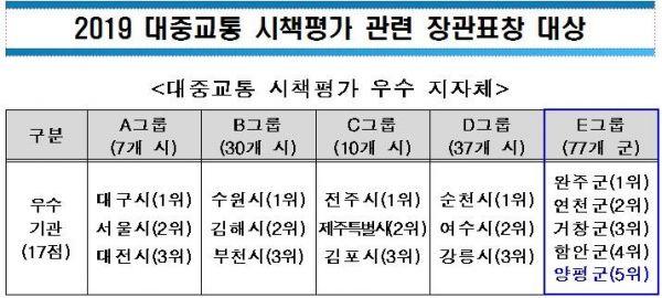 양평군은 국토교통부가 실시하는 ‘2019년 대중교통 시책평가’에서 우수기관으로 선정되어 기관표창을 수상했다.