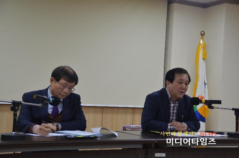 | 28일, 조원덕 국장이 시청 중회의실에서 시청 출입기자들에게 광명동굴과 관련하여 설명하고 있다. (좌측부터, 최봉섭 테마개발 과장, 조원덕 시민행복국장) <사진/ⓒ미디어타임즈> |