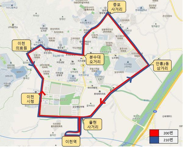 신규 노선은 이천역을 기점으로 이천 시내를 양방향 순환 운행, 운행시간은 오전 07시부터 오후 11시까지 이며세부노선 200번은 이천역→이천시청→이천의료원→관고동→분수대오거리→ 증포사거리→안흥2동삼거리→롯데캐슬→이천역을 운행하며 210번 노선은 반대방향으로 운행한다.