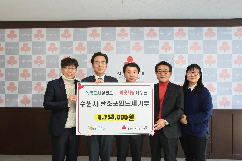 [미디어타임즈= 신정식 기자] 수원시가 ‘탄소포인트’ 참여자에게 지급하는 인센티브 중 기부를 희망하는 715세대의 873만 원을 29일 경기사회복지공동모금회에 전달했다.