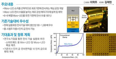 그러나 이번에 ‘메타구조체’ 개발에 성공하고 이를 롤 전사 공정에 적용함으로써, 전사수율과 전사면적을 획기적으로 향상시켜, 기존 기술대비 100~1,000배의 생산성 증대효과를 기대 할 수 있게 됐다.
