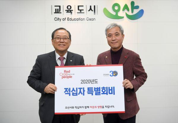 오산시는 19일 시장 집무실에서 곽상욱 오산시장과 윤신일 대한적십자사 경기도지사 회장이 참석한 가운데 적십자 특별회비 전달식을 가졌다.