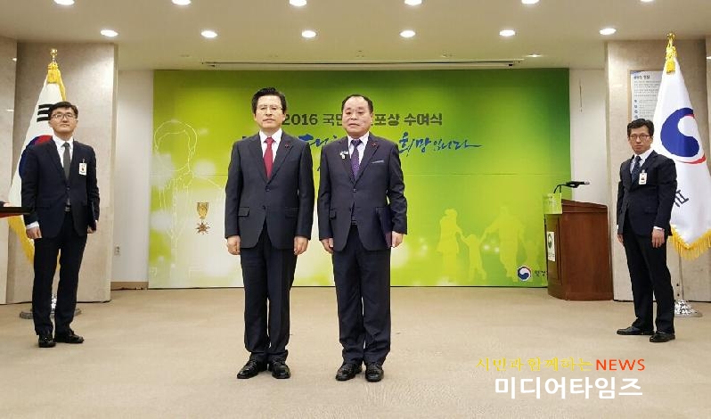 | 29일, 이정환 위원장과 황교안 국무총리가 기념촬영을 하고 있다. (좌측부터- 황교안 국무총리, 이정환 위원장) <사진=미디어타임즈> |
