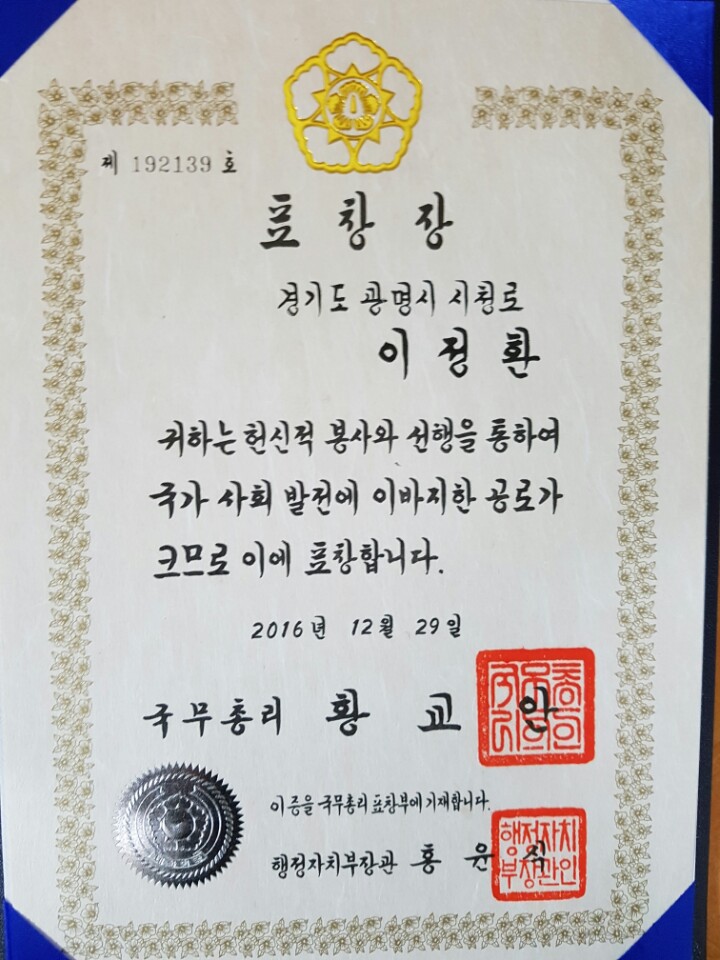 이날 광명시 이정환 위원장(광명시 누리복지협의체 대표위원장, 59)은 ‘시민봉사 부문’ 국무총리 훈장을 받아 지역 주민들로부터 화제다.
