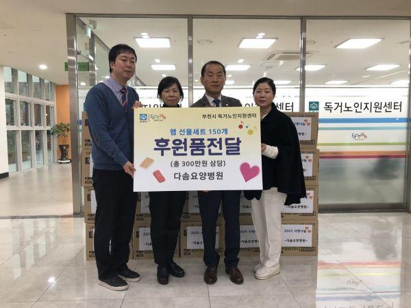 부천시 이장섭 노인복지과장은 “언제나 어르신들을 걱정해주시고 이렇게 선물을 준비해 주신 다솜요양병원에 감사드리며 후원 물품은 독거어르신들에게 잘 전달해 든든하게 겨울을 보내는 데 도움이 되도록 하겠다”고 말했다.