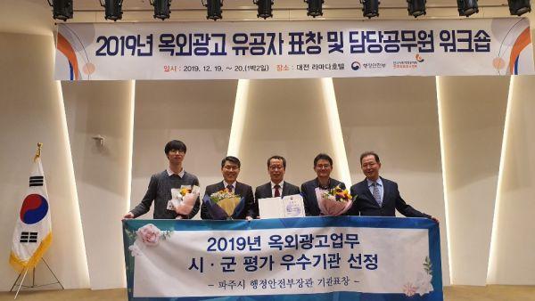 파주시는 지난 19일 행정안전부가 주관하는 ‘2019년 옥외광고업무 시·군 평가’에서 우수기관에 선정돼 행정안전부장관 기관표창을 수상했다.