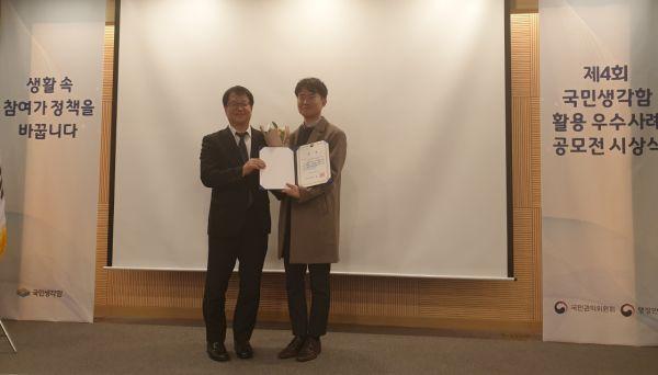 이번 우수사례 공모전은 국민생각함을 활용한 정책참여 사례 및 행정서비스 제도 개선성과에 대해 일반 국민과 행정기관 2가지 부문으로 진행, 이 중 12점에 대해 최우수, 우수상 시상했다.