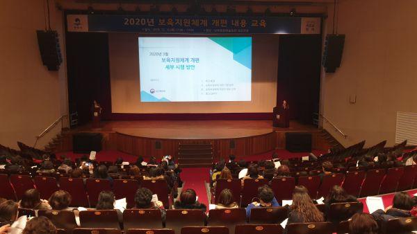 이번 교육은 2020년 3월 시행예정인 보육지원체계 개편 내용인 보육시간 변화, 연장보육 전담교사 배치, 연장 보육료 신설, 자동전자출결시스템 운영 등에 대해 보육현장에서 근무하는 어린이집 원장을 대상으로 진행했다.