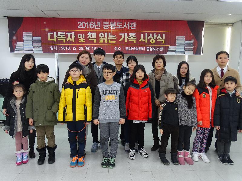 또한 한국도서관협회 가족독서운동 캠페인으로 진행한 2016년 책 읽는 가족에는 변정욱 가족(1,095권)과 김영선 가족(995권), 김시흥 가족(982권)이 선정돼 인증서 및 현판을 수여받았다. 수상한 다독자 및 책 읽는 가족에게는 개인별 대출권수가 1년간 20권에서 40권으로 상향 조정된다.