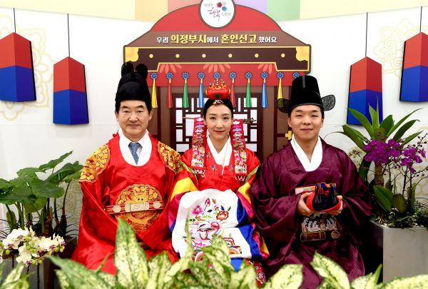 의정부시는 20일 혼인신고를 위해 시청을 방문한 신혼부부를 위해 혼인신고 기념 포토존에서 전통 혼례복을 입고 시장님과 함께 하는 인증샷을 찍는 특별하고 유쾌한 깜짝이벤트를 실시했다.