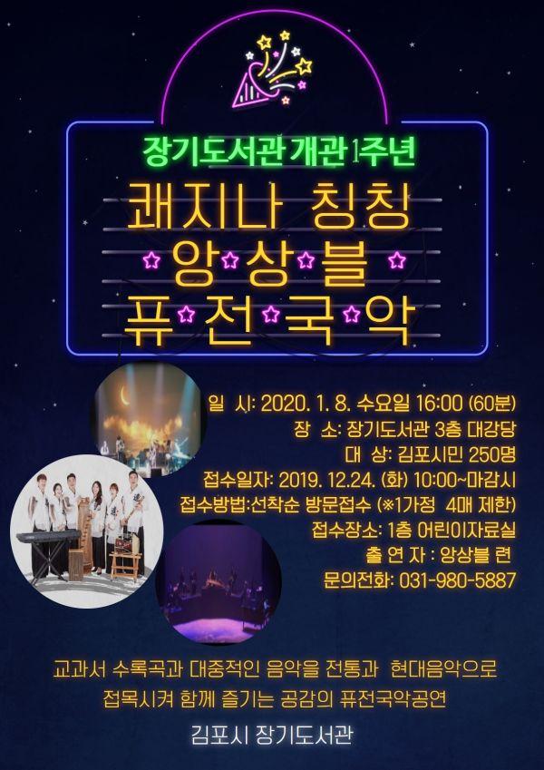 김포시 장기도서관은 개관 1주년을 기념해 2020년 1월 8일 오후 4시부터 5시까지 3층 대강당에서 ‘쾌지나 칭칭 앙상블 퓨전국악’을 진행한다.