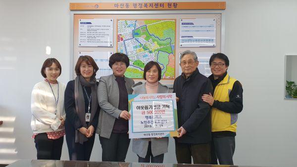 행복플러스노인주간보호센터 임원들은 지난 19일 연말 이웃돕기 성금으로 50만원을 마산동행정복지센터에 기탁했다.