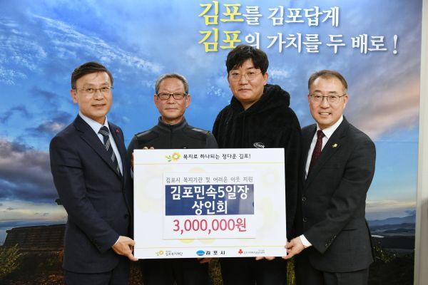 김포5일장 상인회와 마송5일장 상인회는 지난 20일 연말을 맞아 어려운 이웃을 위해 써 달라며 각각 성금 300만원과 100만원을 김포복지재단에 기탁했다.