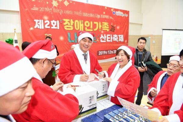 2회째 맞는 ‘장애인 가족과 나누美 산타축제’는 지역 내 장애인 가정에 풍성한 성탄절 및 따뜻한 겨울나기를 돕고자 김상호 하남시장, 이현재 국회의원, 방미숙 시의장, 운영교회인 미래를사는교회 임은빈 목사와 장애인단체장 및 유관기관 단체장, 아이테코 기업인협의회대표, 지호한방삼계탕대표 등을 비롯해 약 100여명의 후원자, 봉사자들이 참가한 가운데 성황리에 마쳤다.