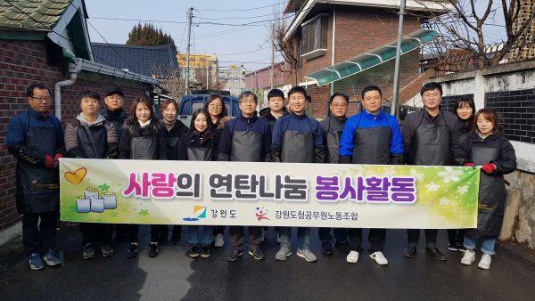 강원도청 공무원노사는 23일 춘천시 근화동 소재 지역 저소득 계층 5가구에 연탄을 배달하는 봉사활동을 펼쳤다.