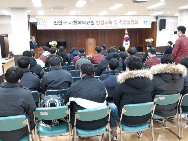 구청과 동 행정복지센터에서 복무 중인 사회복무요원 76명을 대상으로 한 친절교육 및 취업설명회가 지난 19일 안양시 만안구청 3층 강당에서 있었다.