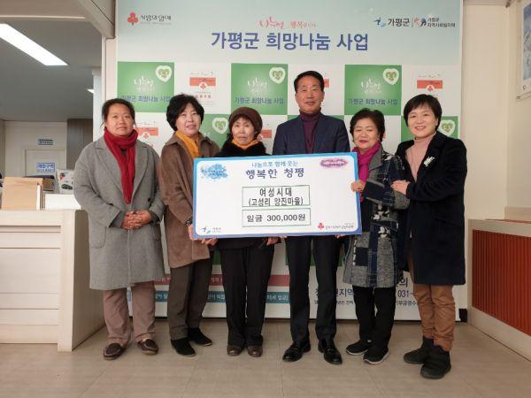 가평군 청평면행정복지센터는 고성리 양진마을 ‘여성시대’ 최근 이웃돕기 성금 30만원을 기탁했다고 24일 밝혔다.