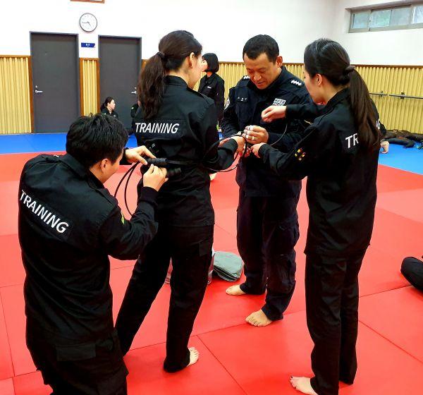 해양경찰 무도교관은 객실안전교관들이 기내 난동 발생 시 신속하고 효과적으로 진압 할 수 있도록 실제 항공기에서 사용 중인 장비를 이용한 체포술과 호신술을 비롯한 해양경찰 무도 교육을 실시했다.