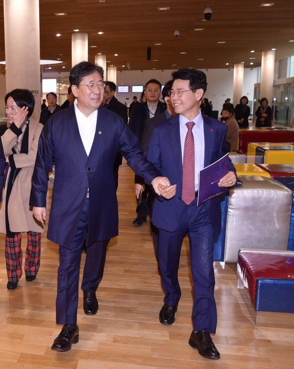 김한근 강릉시장은 지난 21일 광주광역시 국립아시아문화전당에서 박양우 문화체육관광부장관을 만나 강릉시의 브랜드가치 제고를 위한 문화콘텐츠 개발 및 지역 현안에 대한 의견을 나누고 ACC의 대표 킬러콘텐츠 공연 ‘무사’를 함께 관람했다.