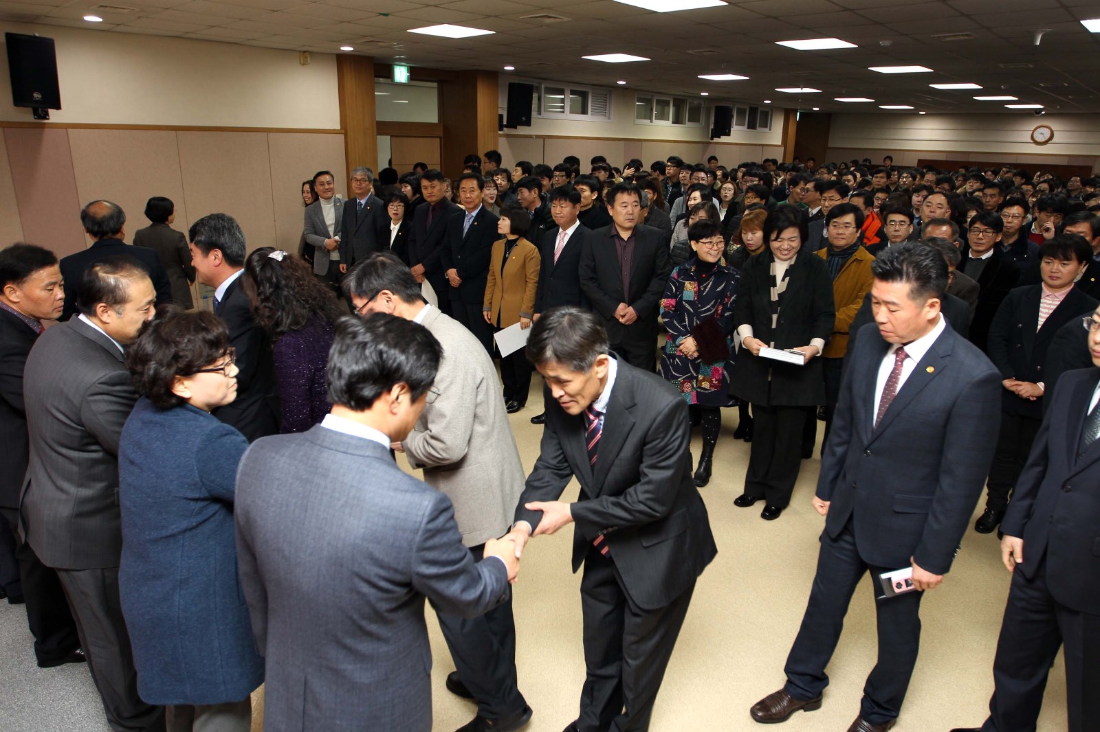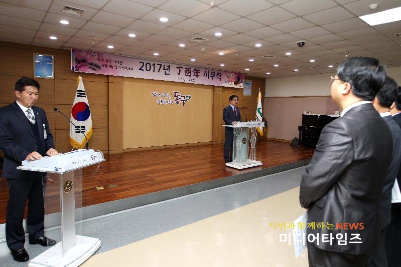 [미디어타임즈=문상수 기자] 인천 동구(구청장 이흥수)는 오늘 오전 구청 대회의실에서 전직원 600여 명이 참석한 가운데 2017년 시무식을 개최했다.구에 따르면, 이번 시무식은 丙申년 한해를 마무리하고 丁酉년 새해를 맞아 전직원 함께 새로운 마음과 각오로 구정 수행 결의를 다지는 자리로 마련됐다.시무식은 국민의례를 시작으로 이흥수 구청장의 신년사, 구민의 노래 제창 순서로 진행됐으며, 전직원들과 간부공무원들이 서로 악수를 하며 새해 덕담을 나누고 신년 새로운 각오를 다짐했다.특히 이 구청장은 신년사에서 ▲아이 낳고 키우기 좋은 아동친화도시 조성 ▲역사와 전통이 살아있는 문화공간 조성 ▲선택과 집중을 통한 효과적인 도시개발 ▲생애 맞춤형 복지구현으로 따뜻한 동구 실현 ▲활력 넘치는 경제기반 마련 ▲환경오염 해결을 통한 쾌적한 도시환경 조성 ▲참여와 소통을 통한 공감행정 구현 등 새해 목표를 향해 역동적인 구정을 펼쳐 나갈 뜻을 밝혔다.또한 이 청장은 “구민들의 열망과 성원이 모여 하나 둘 성과를 이뤄내고 있다”며 “새해에도 구민이 체감하고 희망을 갖는 구정을 펼쳐나갈 수 있도록 전직원과 함께 혼신의 노력을 다하겠다”고 말했다.