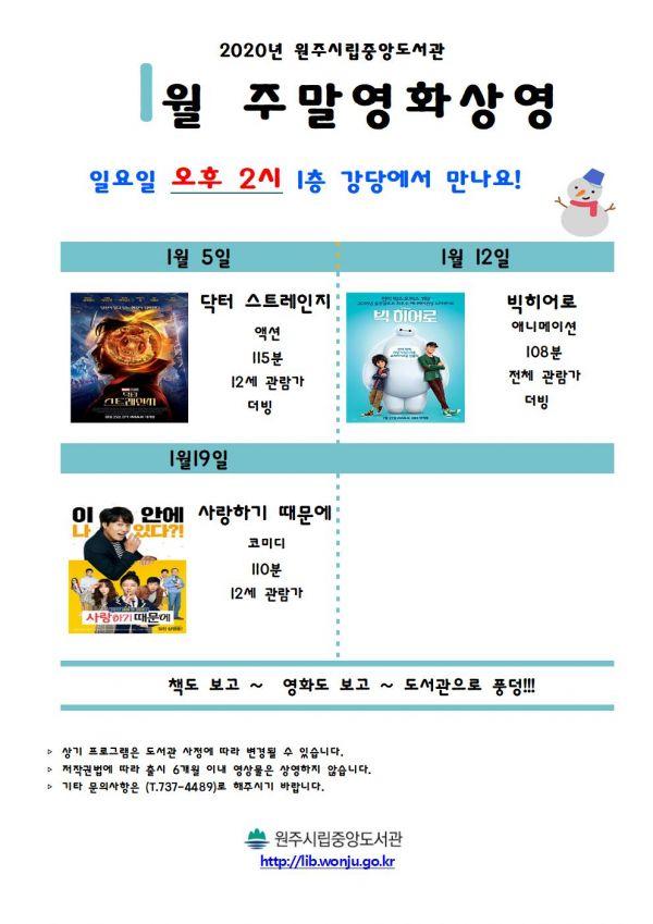 원주시립중앙도서관은 시민의 문화생활을 위해 가족영화 및 애니메이션으로 구성된 ‘주말영화’를 오는 2020년에도 연중 운영한다.