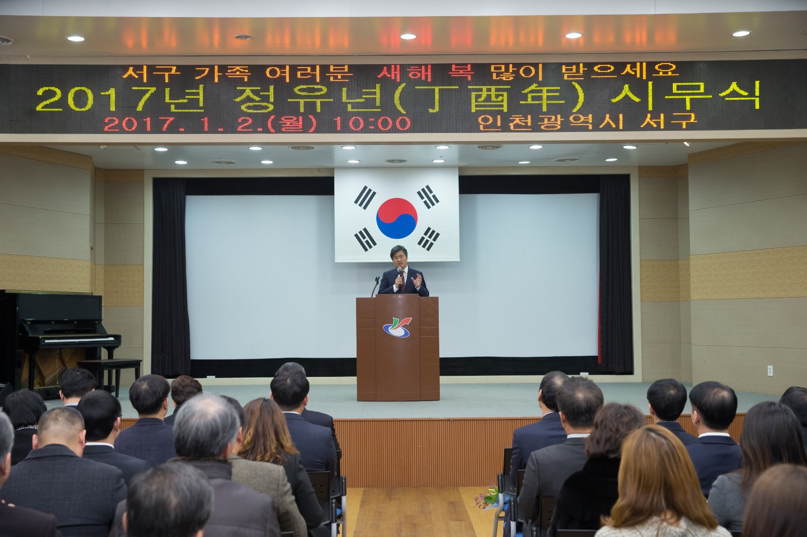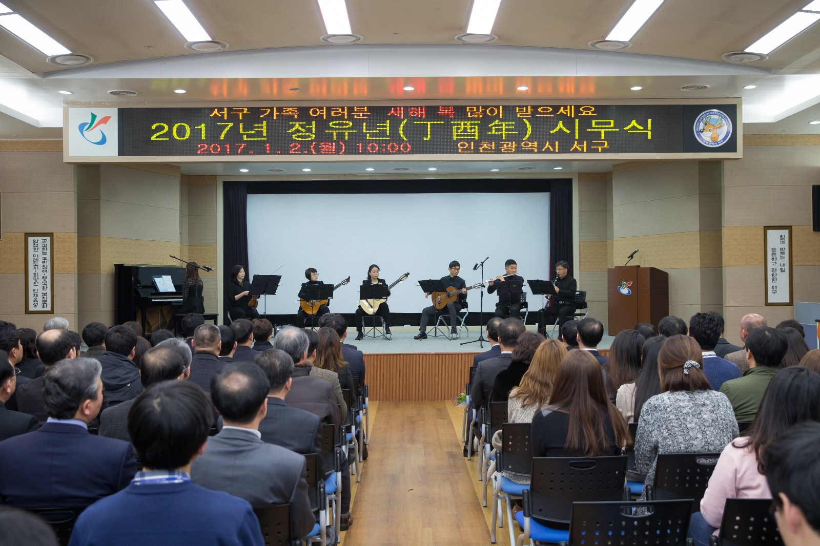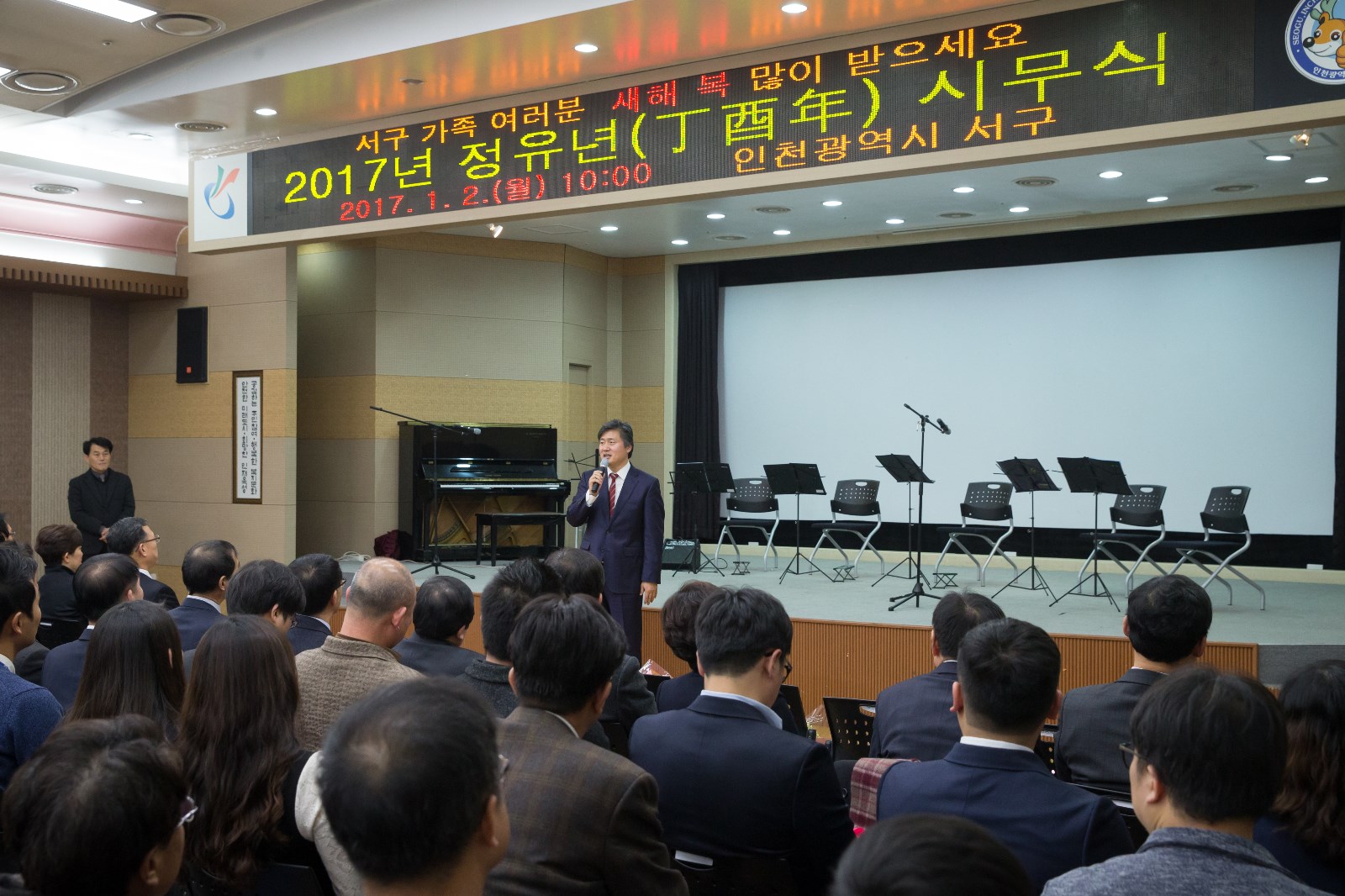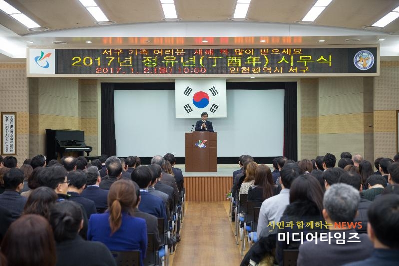 [미디어타임즈=문상수 기자] 인천시 서구(구청장 강범석)는 2017년 첫 근무일에 정유년 새해를 맞아 「든든하고 편안한 서구」건설을 위한 새로운 각오를 다지고자 강범석 서구청장을 비롯한 직원 300여명이 함께한 가운데 시무식을 가졌다.이날 시무식은 구정홍보 동영상 상영, 서구발전 공로자 및 부서에 대한 시상 후 구청장 신년사가 이어졌다. 또, 서구청 공무원 동아리인 소리사랑회의 연주로 한해를 시작하는 직원들을 위해 즐거움을 선사했다.이날 강 구청장은 인사말을 통해 “국가가 혼란기인 상황에서 국가의 지도자들이 선의와 합의로 나아가 길을 찾고 시민들이 함께 참여할 수 있는 시스템을 구축하는 것이 급선무다”라며, “이를 위해 우리 서구도 인천시의 한 부분으로서의 역할을 충실히 해 나가고, 구 자체적으로도 주민을 위해 가장 기본적인 안전과 복지, 교육분야 그리고 덧붙여 서구의 취약부분인 환경문제, 주민의 건강권 분야에서도 초석을 다지는 한 해가 되길 바란다”고 말했다. 시무식이 끝난 후 강범석 서구청장은 참석한 직원들과 일일이 악수를 하며, 신년 인사와 덕담을 나눴다.