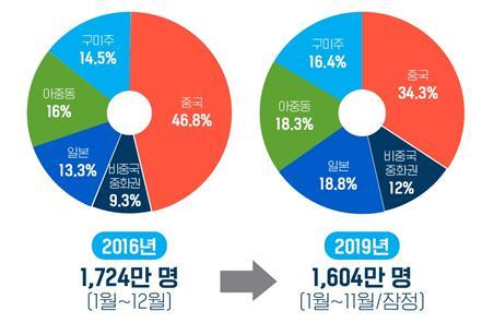 특히 2019년 시장별 외래객 비율을 2016년과 비교하면 중국 의존도가 감소하고 중국을 제외한 모든 권역이 증가해 방한 시장 다변화를 이룬 것을 볼 수 있다.