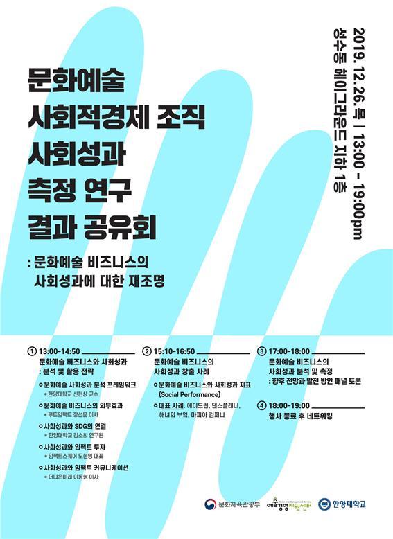 문화체육관광부는 예술경영지원센터와 함께 오는 26일 오후 1시, 성수동 헤이그라운드에서 ‘문화예술 사회적경제 조직 사회성과 측정 연구 결과 공유회’를 개최한다.