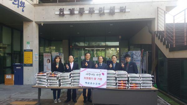 의왕시 학의동에 소재한 백운호수교회가 지역의 어려운 이웃을 위해 써 달라며 지난 20일 쌀 55포대를 청계동주민센터에 전달했다.