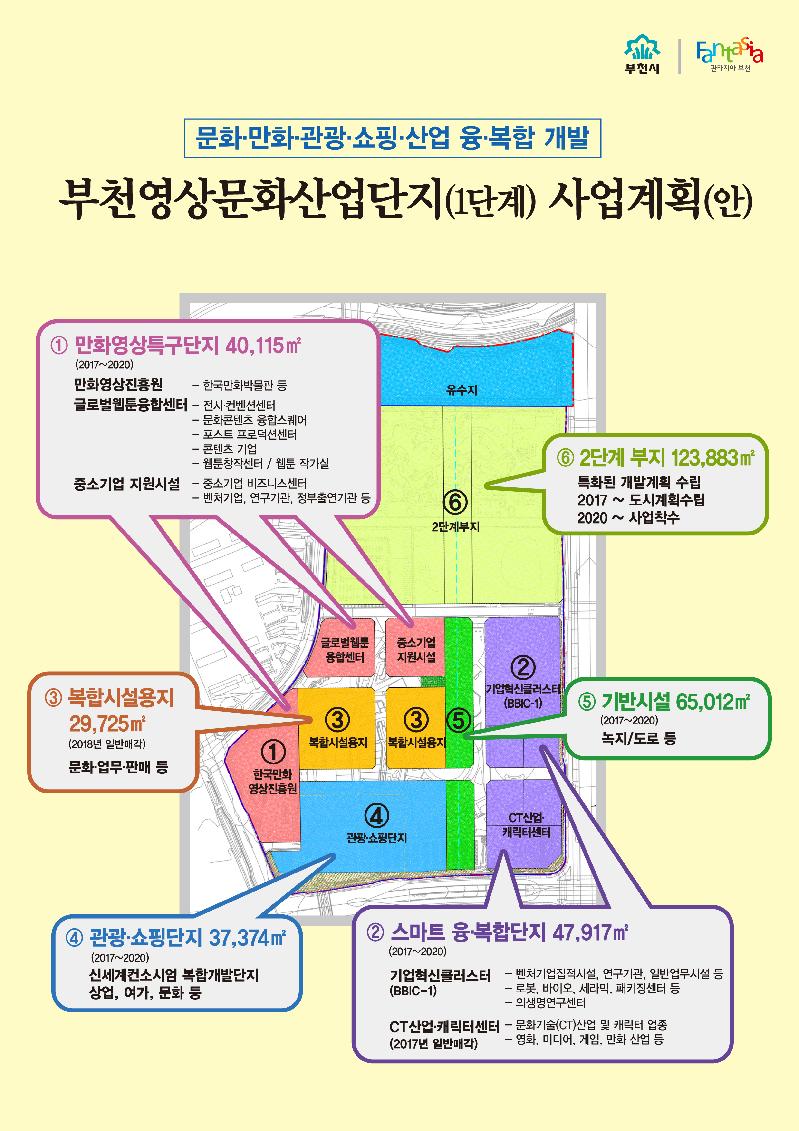 시는 영상문화산업단지에 웹툰융합창조센터, 부천기업혁신클러스터(BBIC-Ⅰ), 영상·CT산업 등 기업집적화 단지, 관광·쇼핑단지 등을 건립해 문화와 만화, 관광, 쇼핑, 산업을 아우르는 부천의 랜드마크로 조성할 계획이다.