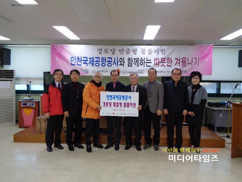 [미디어타임즈=문상수 기자] 대한노인회 인천 중구지회(회장 김영팔)는 지난 12월 27일 중구 노인복지관에서 「인천국제공항공사 후원 중구 전 경로당 맞춤형 물품 기증식」을 개최하였다.기증식에는 김영팔 회장을 비롯하여 인천국제공항공사 최훈 상생경영처장, 최동영 사회공헌팀장, 사회복지공동모금회 박흥철 사무처장이 참석하였고, 경로당 회장 및 회원 50여명이 축하를 나누었다.기증물품은 전자렌지 76대, 컴퓨터 4대, 대형밥솥 75대, TV 73대이며 총 1억원 상당이다.김영팔 회장은 인사말에서 “세밑의 추위에도 불구하고 이렇게 온정을 베풀어주신 인천국제공항공사 후원 및 사회복지공동모금회의 지원에 3천5백여명 노인회 중구지회 회원을 대표하여 무한한 감사를 드리며, 나날이 발전하는 인천국제공항공사가 되기를 기원한다” 라고 하였다.