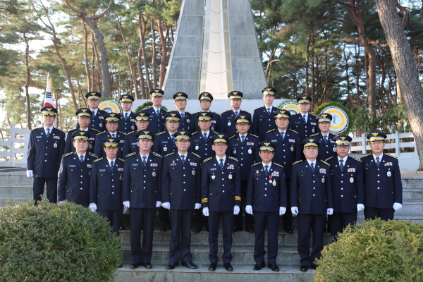 | 2일, 김영관 서장과 직원들이 충혼탑에서 시무식을 마치고 기념촬영을 하고 있다. <ⓒ미디어타임즈> |